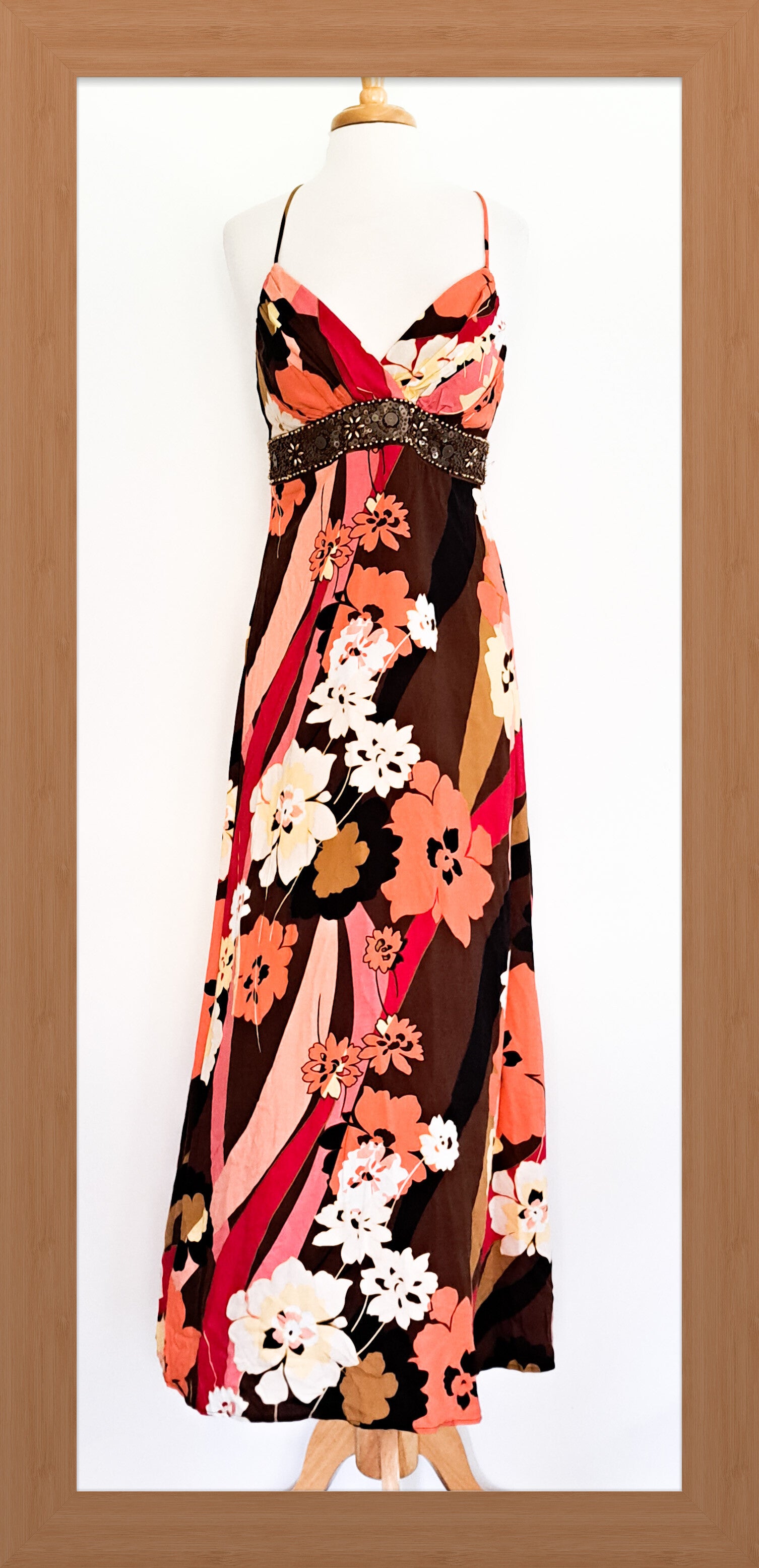 - Gathering bust and beads and sequin trim below bust create a flattering silhouette