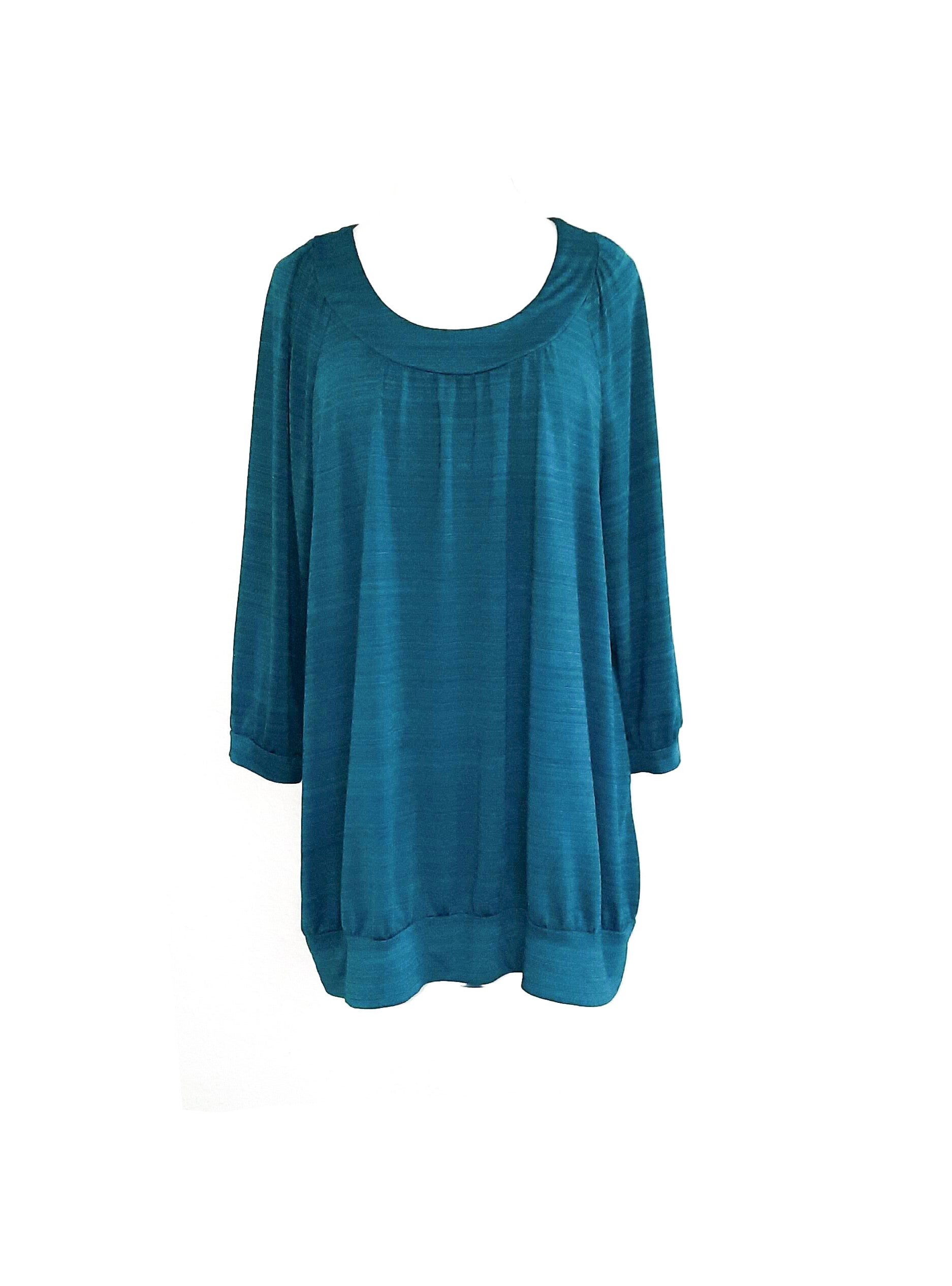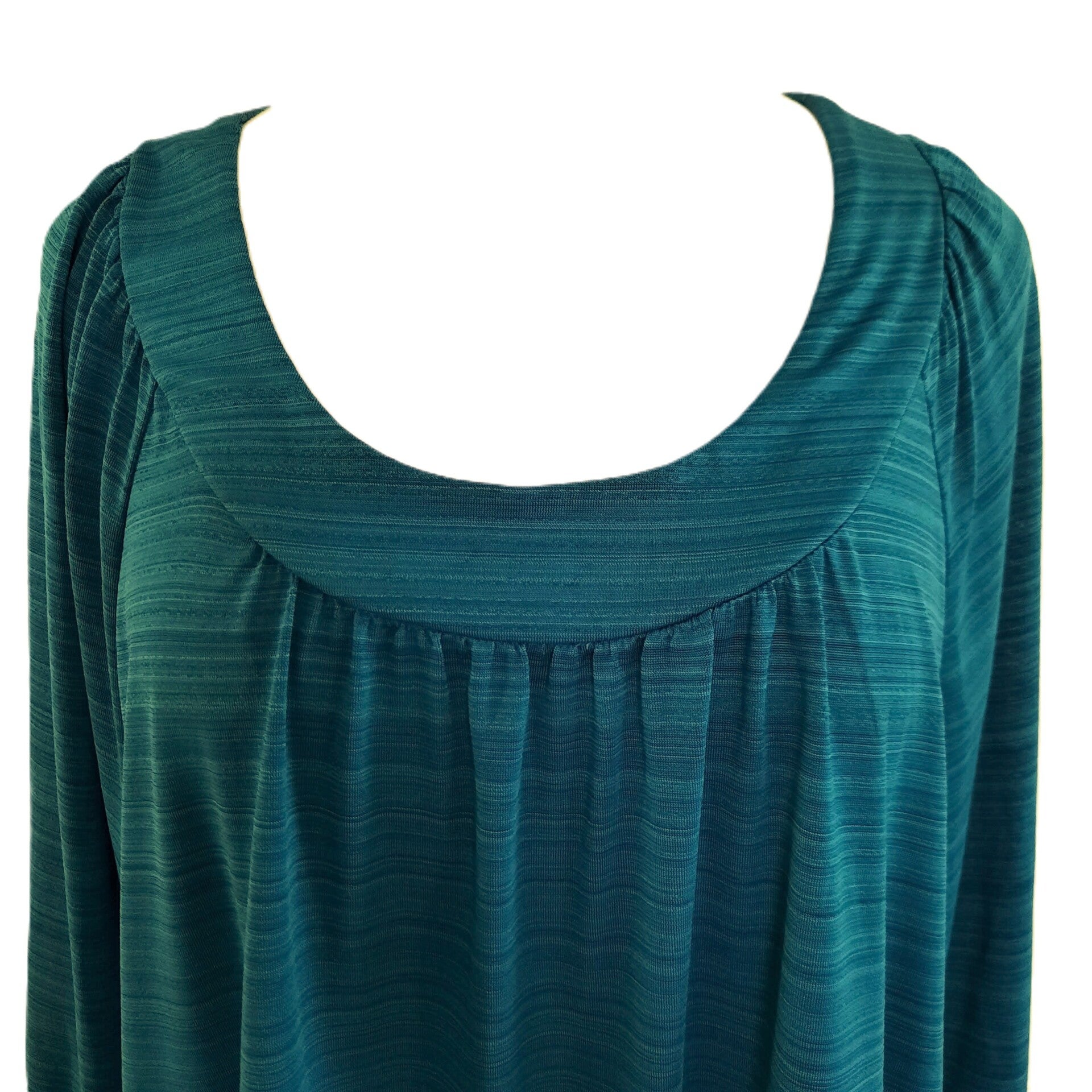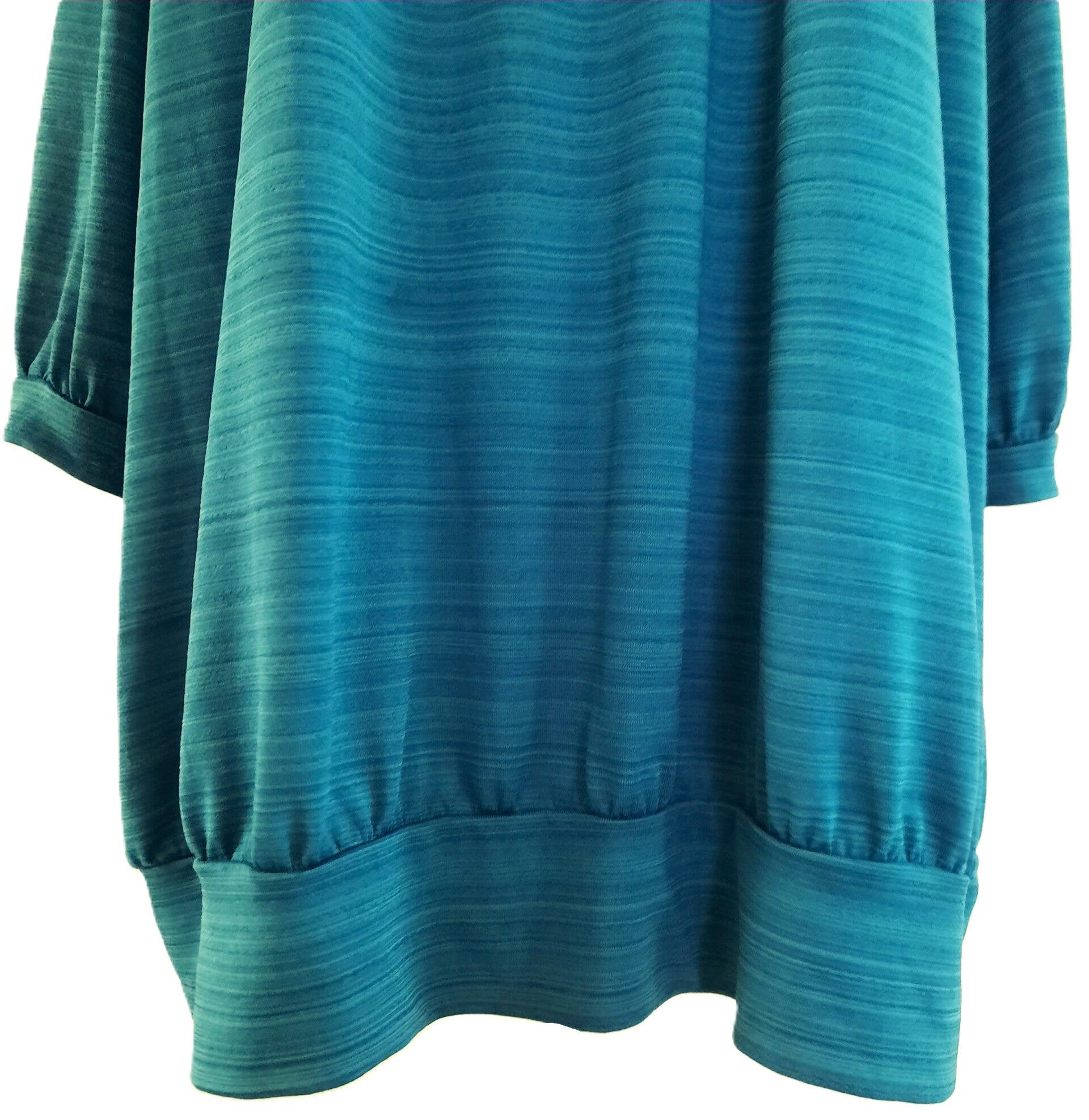 This JUST MY SIZE teal colored top is a perfect addition to your wardrobe. With a loose-fitting style and banded hips, it's comfortable and flattering for all body types. The raglan sleeves add a touch of elegance to this basic, casual top.